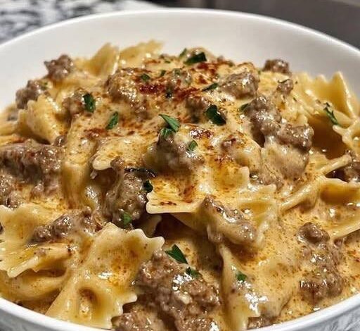 š High-Protein Creamy Parmesan Garlic Beef Bowtie Pasta