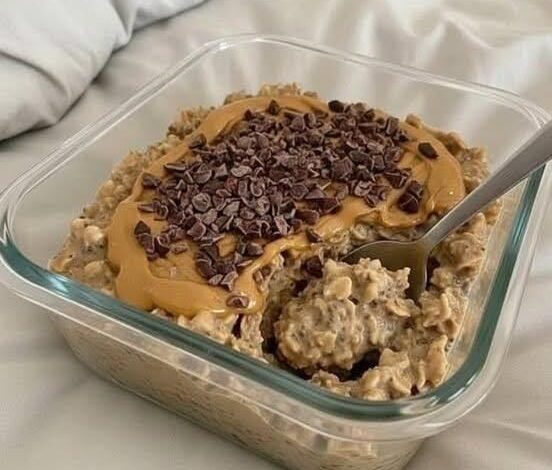 In the morning, top with cacao nibs for crunch and drizzle with peanut butter for creaminess. Enjoy!