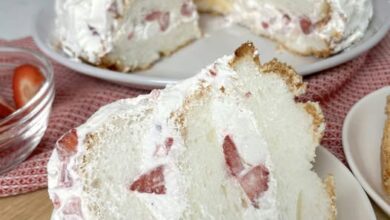 IngredientQuantityAngel Food Bundt Cake1Cool Whip, thawed16 ozFresh strawberries, dicedGroceries2 ½ cupsMini marshmallows2 ½ cupsSliced strawberries (optional)For decorating Instructions: If you…