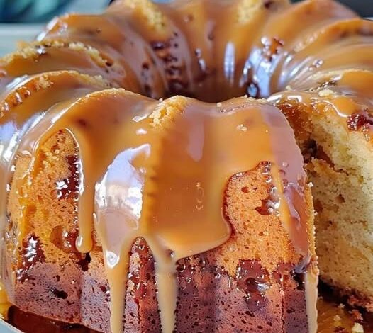 Drizzle Caramel Over Cake: Once the cake has cooled completely, spoon the prepared caramel drizzle over the top of the cake, allowing it to drip down the sides.