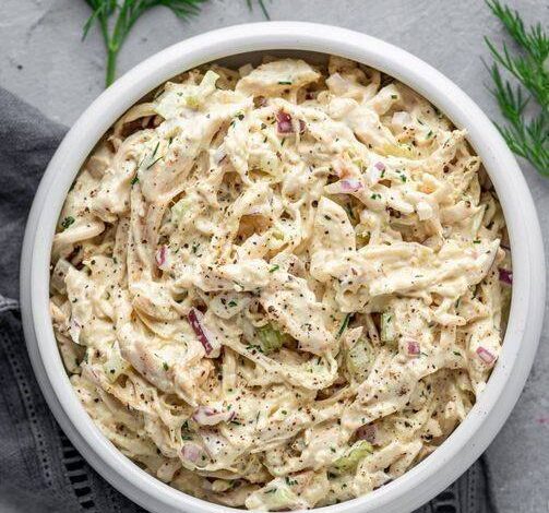 A protein-packed, creamy chicken salad made with tender shredded chicken, crunchy celery, red onion, and fresh dill, tossed in a light yet flavorful dressing. Ideal for sandwiches, lettuce wraps, or as a high-protein snack.