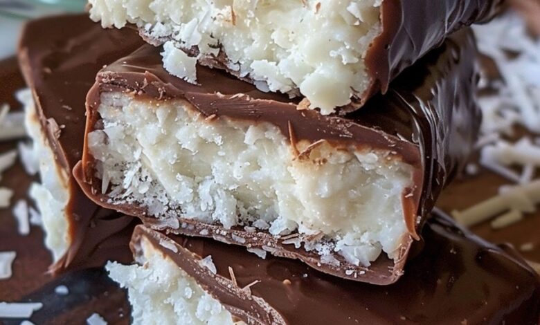 - Dip the coconut bars into the chocolate with two forks till they are well covered.