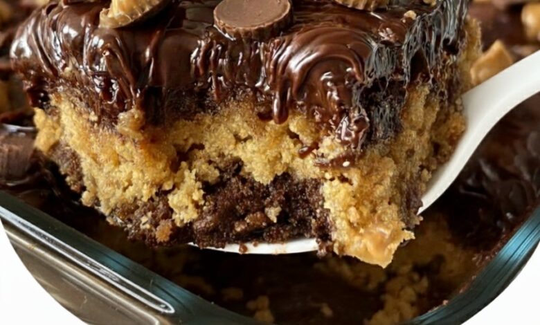 - Spread the cake batter over the peanut butter and chocolate chips layer.