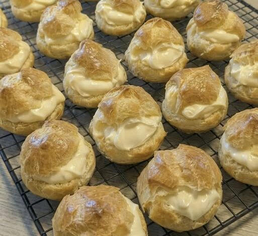 - Slice cooled cream puffs in half or poke a small hole in the bottom.
