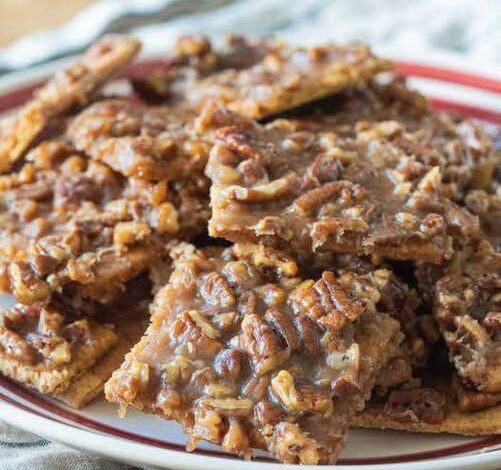 Pour over crackers: Immediately pour the hot pecan-caramel mixture evenly over the layer of graham crackers. Use a spatula to spread the mixture to the edges of the pan, ensuring the graham crackers are mostly covered and the pecans are distributed as evenly as possible.