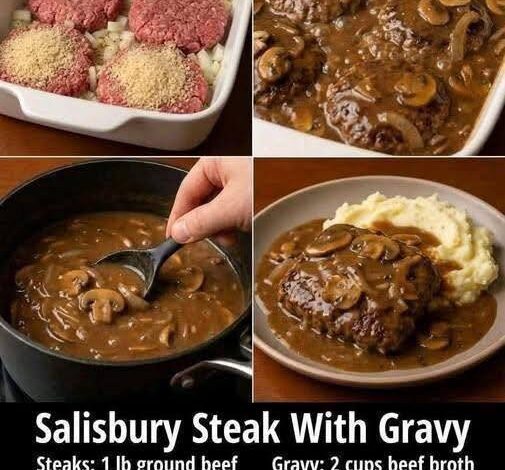 This Salisbury Steak with Gravy is made with juicy, seasoned ground-beef patties simmered in a deep, savory mushroom-onion gravy. It’s cozy, filling, and tastes like a homemade diner classic — simple ingredients, big flavor.