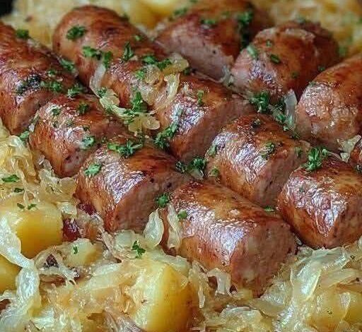 Start by slicing the sausages into bite-sized rounds and peeling and cubing the potatoes. Chop the onion and drain the sauerkraut well to remove excess liquid.