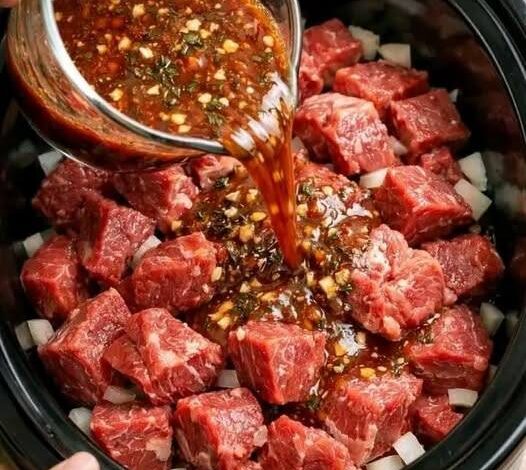 Arrange beef cubes evenly over the vegetables.
