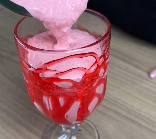 1. Prepare glass: Drizzle strawberry syrup inside glass.