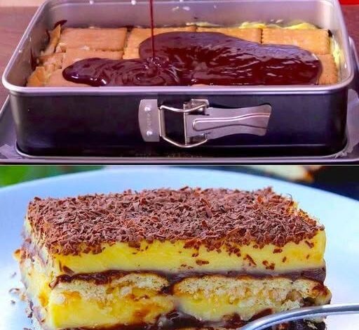 - Add a layer of pastry cream, followed by another layer of biscuits and chocolate, allowing each layer to chill for 15 minutes.