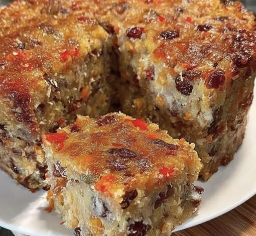 Gradually add the dry ingredients to the wet mixture, stirring just until combined. Gently fold in the soaked fruits along with any remaining liquid.