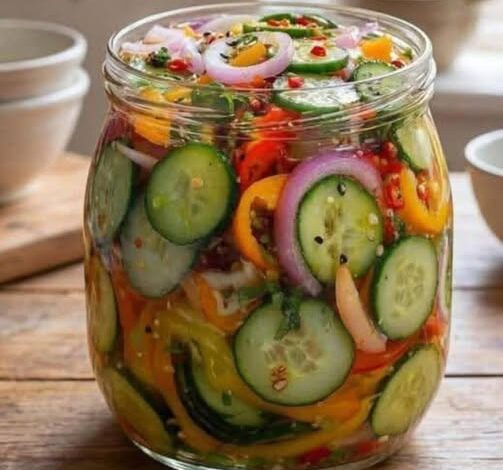 - Pour the pickling liquid over the vegetables until fully submerged.